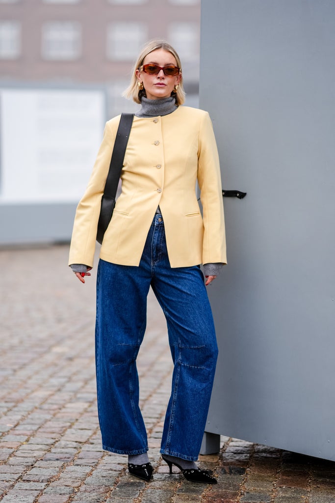 COPENHAGEN, DENMARK – JANUARY 30: A guest wears Miu Miu sunglasses, golden earrings, a pale pastel yellow jacket, a black leather bag, blue denim jeans pants , pointed shoes, outside Rolf Ekroth, during the Copenhagen Fashion Week AW24 on January 30, 2024 in Copenhagen, Denmark. (Photo by Edward Berthelot/Getty Images)