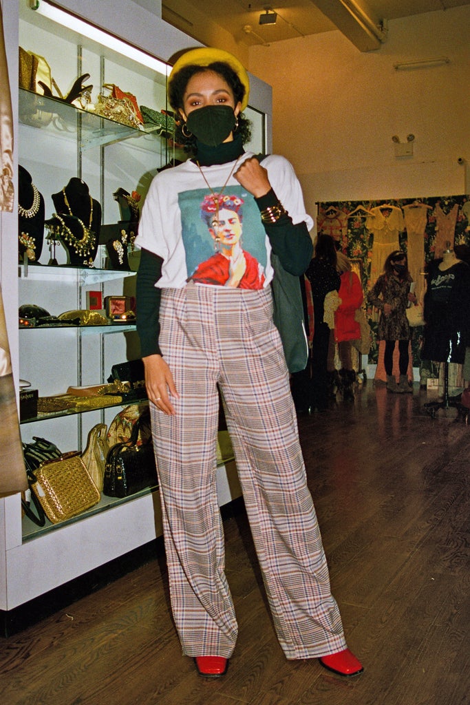And people were there. Some, like Lachlan Watson, planned their outfit to stand out from the crowd, which fills up the space as soon as the doors open. “I wanted my friend to be able to find me very quickly if I got lost,” says Watson, who whore a hot pink velvet vest and pants, paired with a matching fuzzy bucket hat and a white turtleneck. Kayla Robinson, a first-time attendee, sported a T-shirt with the face of Frida Kahlo emblazoned on the front, a beret, and a pair of plaid pants. “These are all clothes I’ve had for a couple of years that I’ve just continued to maintain and just mix and match in different ways,” the Texas-based collector, who loves vintage shopping for the sustainability factor, says.