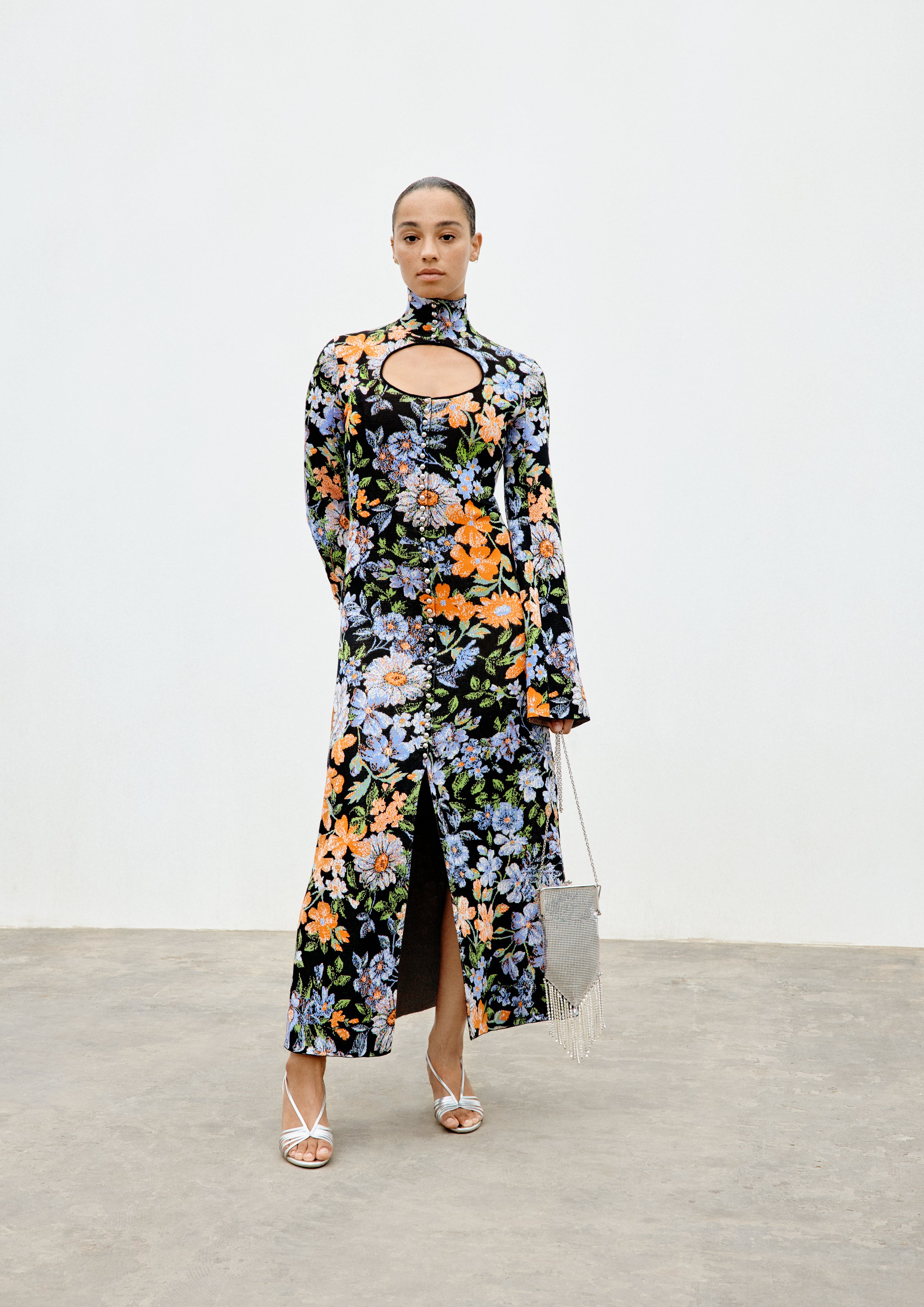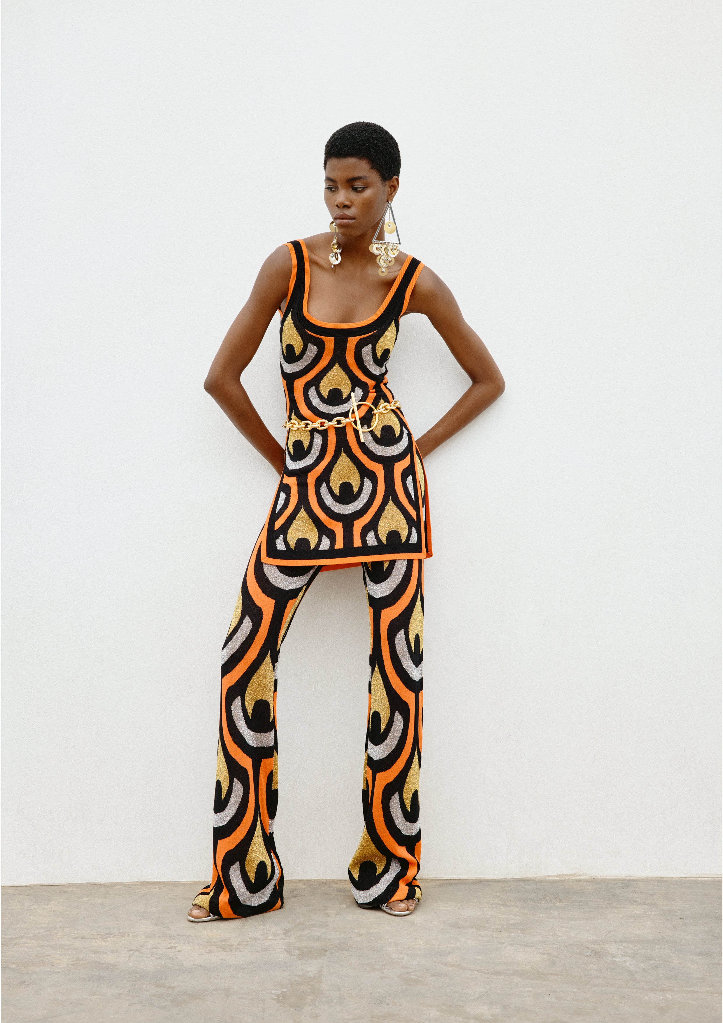 Launching on November 9, the Rabanne x H&M collaboration brings the innovative, retro-glam and futuristic designs the former has long been known for to the masses. Think of the line as the vibrant, ready-to-wear dress code answer to a lavish 1970s pool party-meets-cocktail hour (or, you know, a holiday party), with glittering disco dresses made with metallic mesh and mirrored paillettes (a nod to iconic Rabanne archival pieces) in shining purple, silver and gold hues. Even the loungewear feels party-forward thanks to slinky silhouettes and ribbed-knit textures. Other notable looks include a jacquard knitted two-piece set in a bold, geometric print with orange accents and an Old Hollywood-esque fuzzy coat.