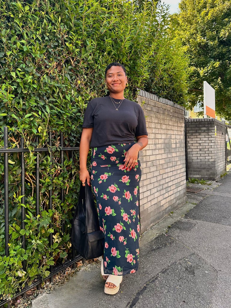 “I love pairing oversized silhouettes with tighter fits — like wide-leg pants with a bodysuit, a boxy jacket with a fitted dress, or a boyfriend tee with a boycon midi skirt. For my Skims tee trial run, I styled it for weeknight dinner plans with a floral maxi skirt, an oversized handbag, and platform sandals. I loved that it was super comfortable and easy to pair with. However, the medium (my regular size) felt a little too big, and I didn’t really know what to do with all the fabric. So, I’d recommend going a size down. As for next time, I will probably wear the tee untucked with more casual outfits.” — Ebony-Renee Baker, Fashion Editor