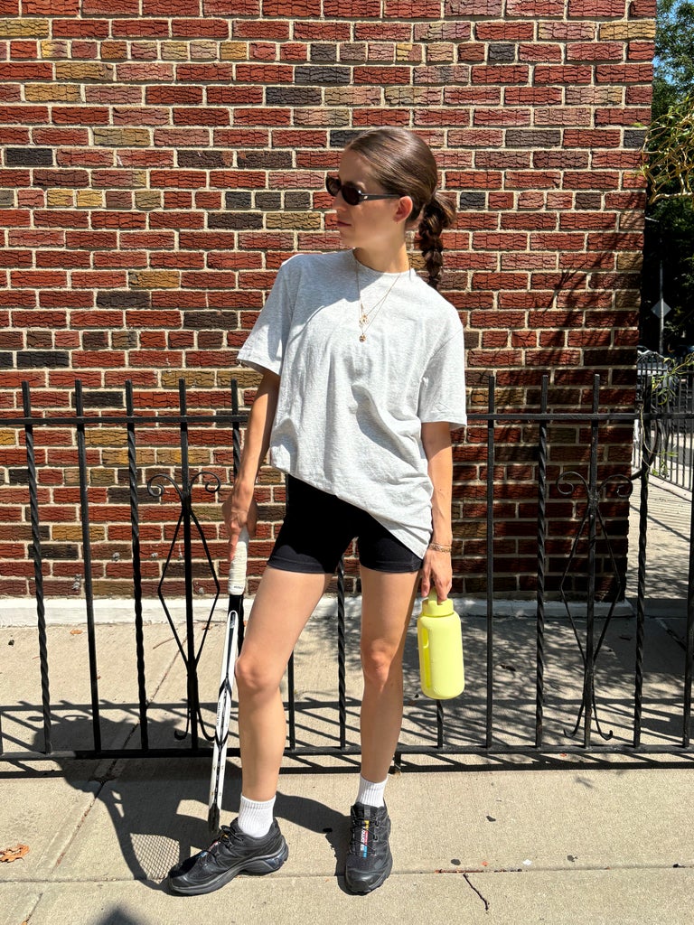 “My silhouette preference has always been oversized, so I knew I’d like the boxy loose fit of this boyfriend tee. I find I wear this T-shirt most when dressing for any physical activity or casual outing because it’s breathable and unrestricting. I also find that it works best on my petite frame with more fitted bottoms. Here I’ve styled it for an afternoon of tennis with bike shorts and sneakers, but I just as often swap the performance sneakers for a more casual pair for a coffee run. Personally, I’ve found the boyfriend T-shirt to be really versatile. I wear it with activewear, denim, and even sleep in it. The fabric is also buttery-soft — almost cloud-like — but unlike most fabrics of this nature, I’ve found it doesn’t pill at all after many wears and several washes. Although I’m wearing the heather grey colorway in this photo, I’ve had the marble color for several years and can definitely vouch for its durability.” — Kate Spencer, Sr. Affiliate Partnerships Manager