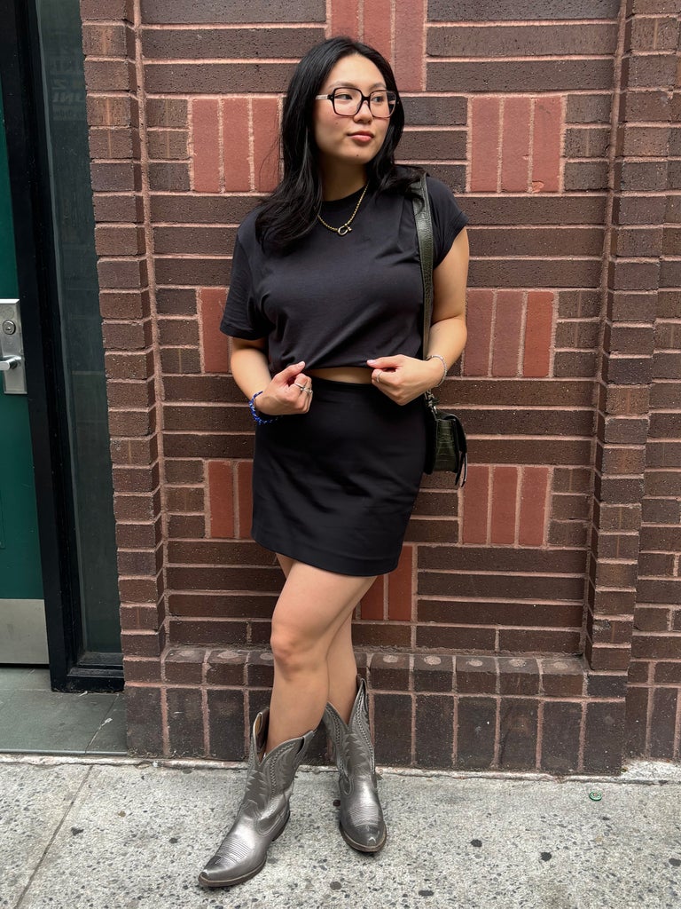 “Normally I’m a size large in tops, but I got the medium in the Skims Boyfriend T-Shirt and styled it for a date night out. While the length was a bit too long for the outfit that I wanted to style it for, it was perfect once I tucked it into my bra to faux-crop it. I paired the shirt with a black mini (big monochromatic black outfit girlie here), silver jewelry and silver cowboy boots, and a green leather shoulder bag. This is a great casual date night outfit for drinks or dinner as it’s comfortable and chic without too much effort. In the future, I’ll probably style it with low-rise jeans, jean shorts, or even over slip dresses for a dressier occasions since it’s a comfortable basic that can be paired with anything.” — Becca Sax, Affiliate Coordinator