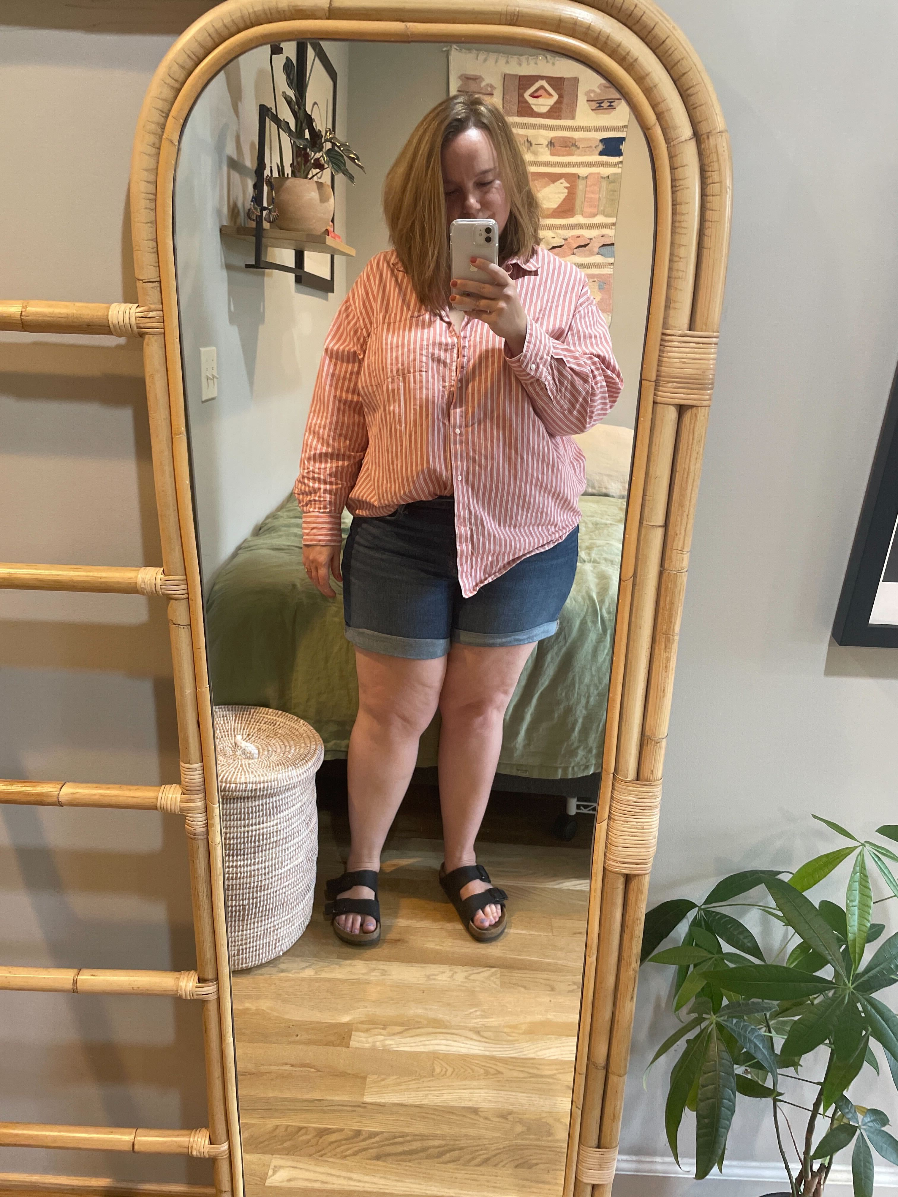 “Recently, a picture of one of my favorite drag queens sent me on an online shopping journey. Monet Xchange posted this look on Instagram and suddenly I knew I, too, needed a pink striped button-up for the summer. I landed on one from Old Navy that, while not a perfect match, had the same balance of feminine vibes matched with the oversized, boyfriend fit. So far, I’ve knotted it to wear with leggings and shorts around the house and attempted a French tuck with jeans and loafers for a more polished look. It’s long-sleeved, but the light weight of the fabric will make it a good coverup for the beach and pool. In other words, a pink striped oxford was the summer basic I didn’t know my wardrobe was missing until now. PS- Team Monet for All Stars 7″ — Marshall Bright, Affiliate Editor.