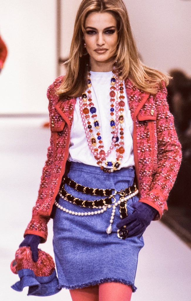 In a fashion glow up, during Chanel’s fall ‘91 show, Karl Lagerfeld sent model Karen Mulder down the runway wearing none other than a white T-shirt, paired with a hot pink tweed jacket, a royal blue mini skirt, and so much jewelry that the late designer was quoted in Vogue saying that he adorned her to look “just like a Christmas tree.” The addition of the T-shirt could’ve easily gone unnoticed under the weight of so many accessories. Yet, it remains, to this day, one of the first examples of a white T-shirt in high fashion.