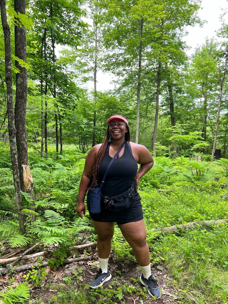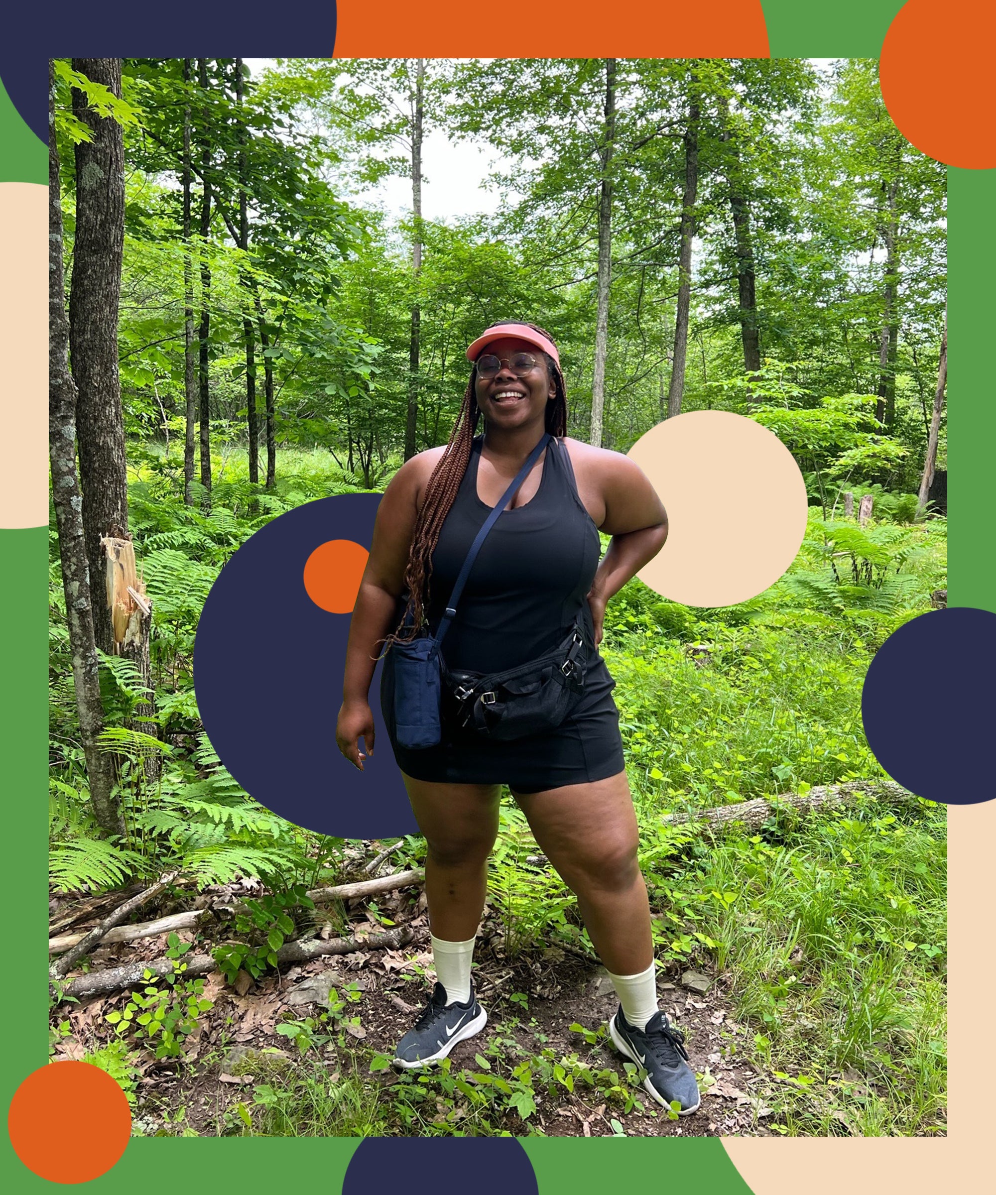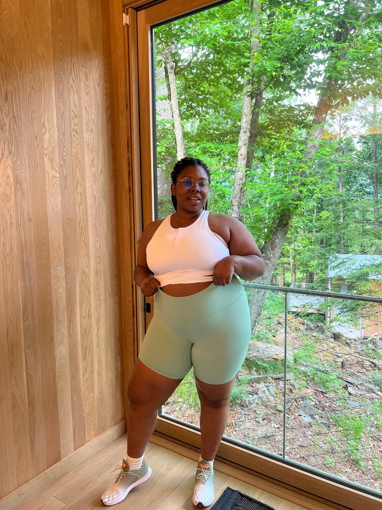 “The dress felt very soft and offered up a little more coverage than if I wore the salutation shorts and ultimate bra on their own. Since the dress didn’t have a built-in bra or shorts, it was nice to add in classic athlete pieces for more support. However, if you have chafing balm, the shorts aren’t needed. I love that I got a chance to try on a workout dress and the calm forager trail hike was perfect for a fun but cute outfit. If I were to go back, I’d probably snag the 7-inch salutation short instead because I love any chance for longer short inseams for more coverage.” —Chichi Offor