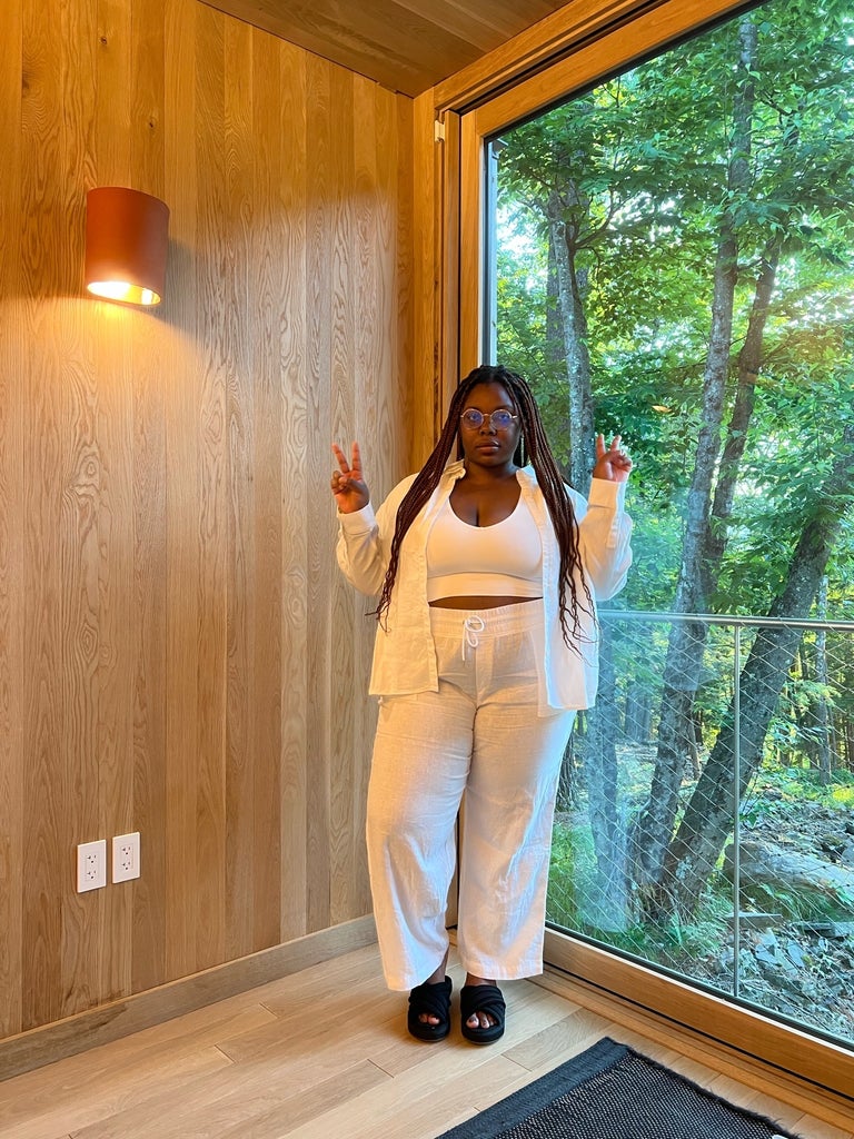 “This was probably my favorite look of the whole weekend for non-athletic activities. I wore this for dinner, an astrology reading under the stars, and s’mores by the fire. The linen is light and slightly roomy, so it’s a super-comfy fit. Although the line was light feeling, it felt substantial, like it was constructed with top-notch quality in mind. I hardly ever get a chance to rock an all-white, monochromatic outfit, so I was super excited to put that to the test.” —Chichi Offor