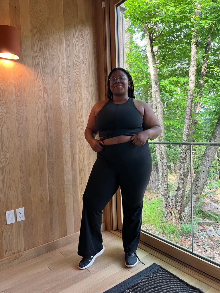 “I wanted to do another monochromatic moment during the trip, so I went for a classic all-black look for yoga. I’ve tried the elation material before in the legging form, and these flare pants live up to just what I expect. There’s a little compression but not too much. It’s great for moving freely and stretching deeply as I did in my yoga practice that morning. The black-conscious cutout crop looks good enough to wear for a casual hang or even a date night with a skirt! I cannot emphasize enough how awesome it is to wear tops without bras and still feel supported as a large-chested woman!” —Chichi Offor