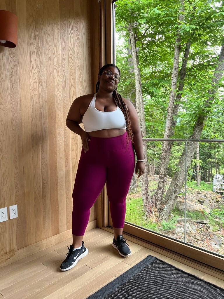 “I used this outfit combination to do a HIIT workout. The ultimate stash leggings held up surprisingly well as I shifted, lunged, and jumped through multiple positions. While the leggings aren’t as soft as some other Athleta pieces, they do have a solid amount of compression. Plus, I think the fuchsia colorway is AMAZING. The ultimate bra was cute and was great for most of the moves. However, I found that my breasts hopped up and down a little more than I liked during the jumping movements. I think this bra is good for medium- to low-impact workout movements or light jogging.” —Chichi Offor