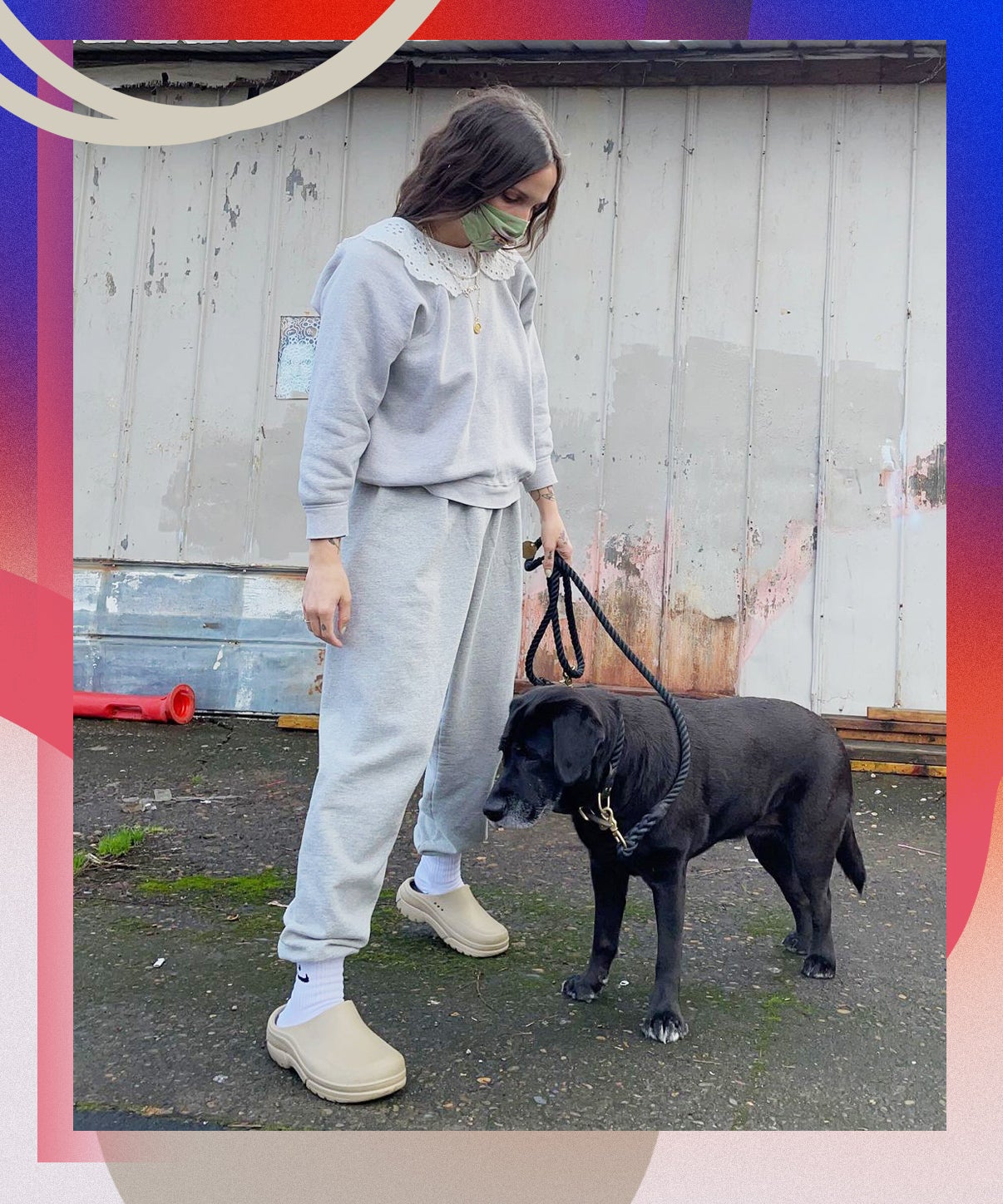 As a proud feline-owner myself, I didn’t have any means of fact-checking her. So I called on another dog mom named Karyn Fiebich, who, like Baila, after seeing my clogs on social media, bought herself a pair. She now wears them to walk her dog, as well as make flower deliveries for her Portland-based flower shop Osa Floral. “My black lab daughter Gemma and I go on a lot of walks in varying elements,” Kiebich tells Refinery29. “Not only are rubber clogs weather-proof, but they also add a little bit of personality and drama during my every day, usually uneventful activities.” Drama is right. “It’s a ridiculously oversized, cloud-like shoe that is literally the most comfortable thing I’ve worn on my feet,” she says.