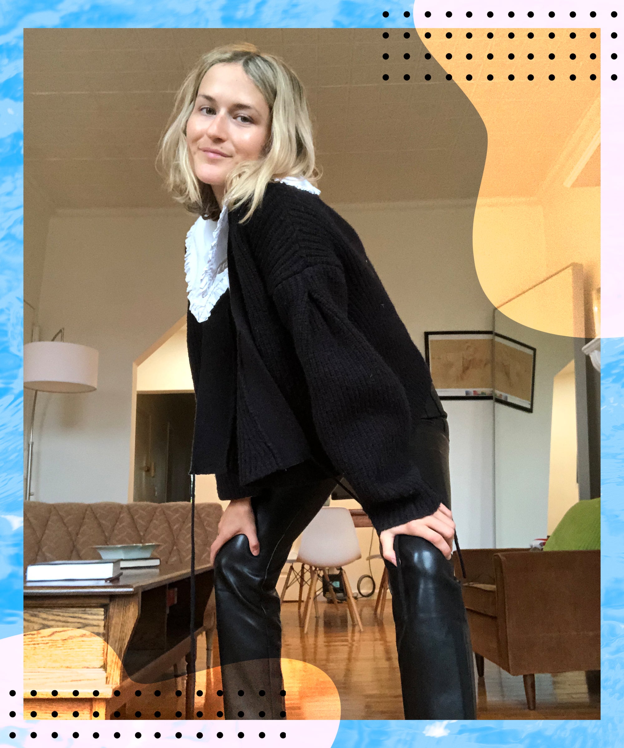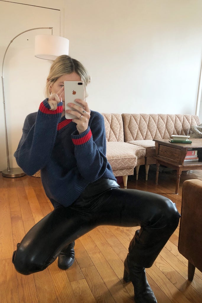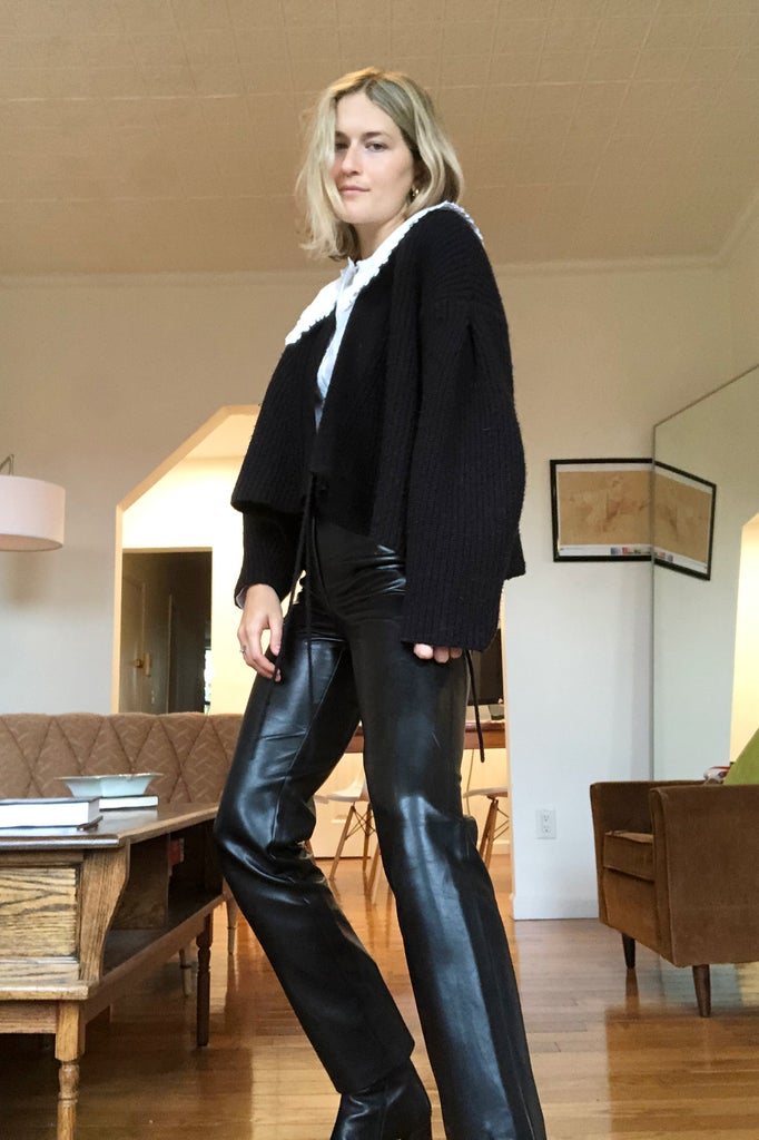 Inspired by the TikTok buzz, I pulled my own pair from the back of my closet. Slipping them on, I remembered all the qualities that kept me coming back time and time again: the length isn’t cropped, meaning that they actually reach my ankles, something that most leather pants don’t do given that I’m almost 5’9; the waist tapers in rather than leaving that all-too-common gap in the back of pants; and the lining inside allows them to straddle the line between keeping you warm in the outside winter weather and making you too hot inside with the heat on. (If only Ross Geller had hit up Aritzia — that whole baby powder-plus-leather pants fiasco could’ve been avoided.) To break up the hours of TikTok scrolling I’ve been doing of late, I brought out my self-timer and a few different sartorial add-ons that are also lying in wait for the world to safely re-open. First, for a comfy daytime look, I threw on a blue-and-red sweater with a school-boy-like V-neck collar that I just got from London-based skate and fashion brand Thames. Then, for a nighttime transition, I swapped out the knit for a ribbed, white tank top. I also threw on an oversized, faux leather button-down from Aritzia, which I wore open, and, later, a Ganni shirt with an XXL collar paired with a chunky knit from Oak + Fort.