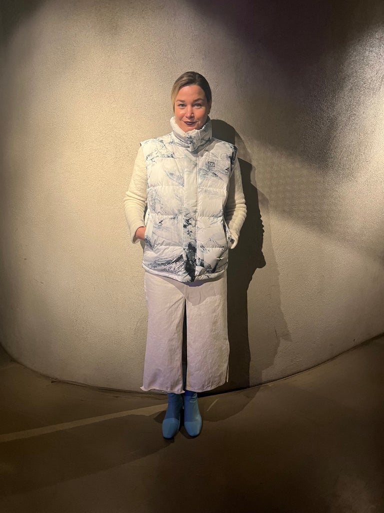 Unless I have to travel far or face elements like snow or rain, I avoid wearing outerwear while going out at night, which, in this case, involved me making my way from my apartment to a restaurant for dinner and a bar afterward. For this winter white look, I chose two layers — a HeatTech turtleneck underneath the same Icelandic wool sweater and wool tights underneath a midi skirt and knee-high boots — and topped it off with a high-collar down vest featuring a glacier print made from images captured by Benjamin Hardman in Iceland. Bonus tip: Supplement the lack of true outerwear by accessorizing with some fun (wool) mittens and a hat that you can take off while indoors.