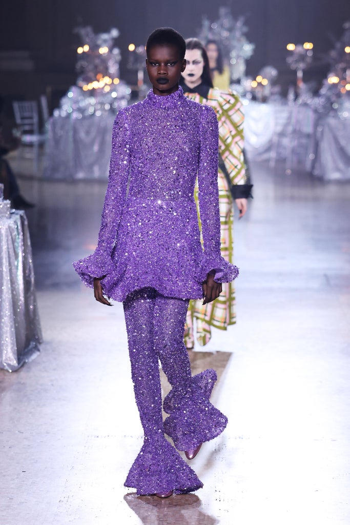 Y2K may no longer be the buzziest aesthetic of the moment, but its influence remains on the runways through the dress-over-pants styling cue. Seen at Hervé Léger and Rodarte, this trend lends itself well to tunics and dresses in a sheer or lustrous fabrication or with a hemline that offers extras like fringe or waterfall ruffles for a little extra opulence. As we see this look evolve, we can look forward to a range of day and night interpretations through an array of layering options.