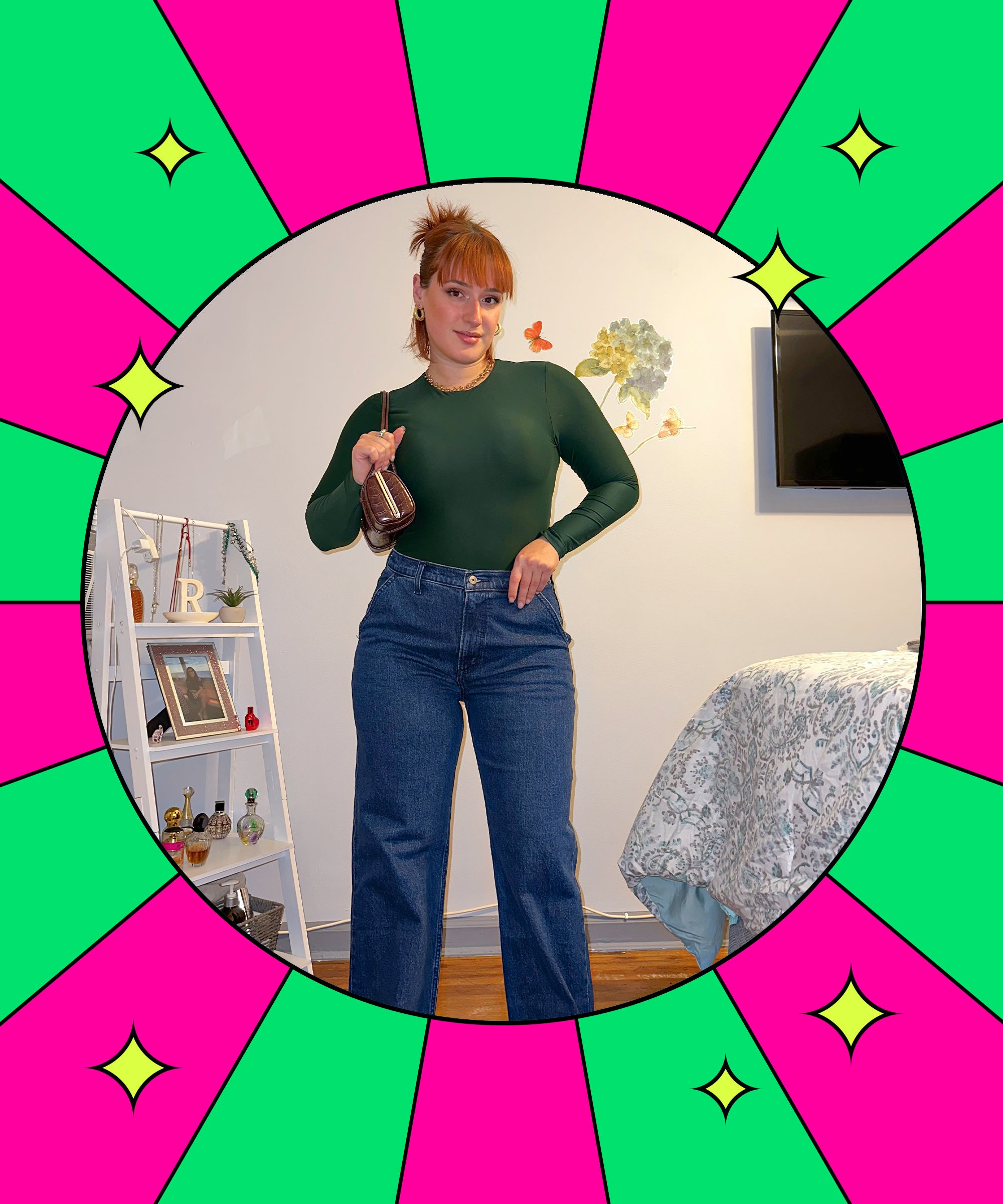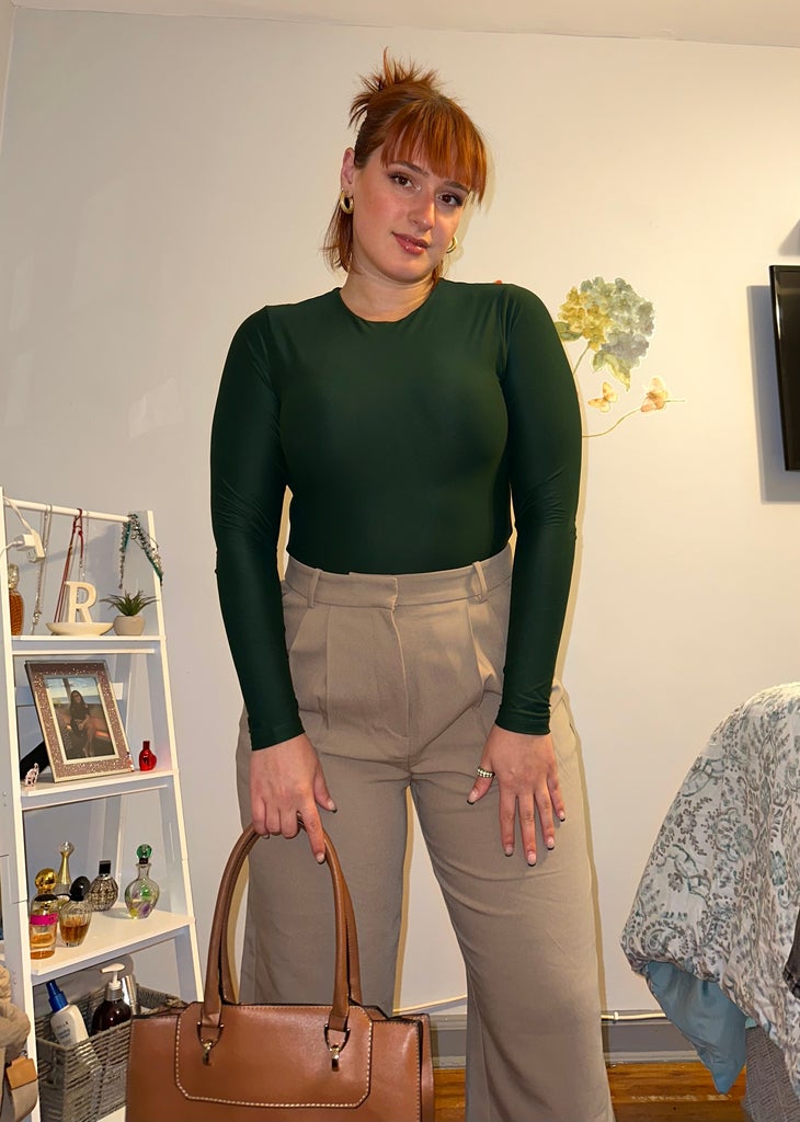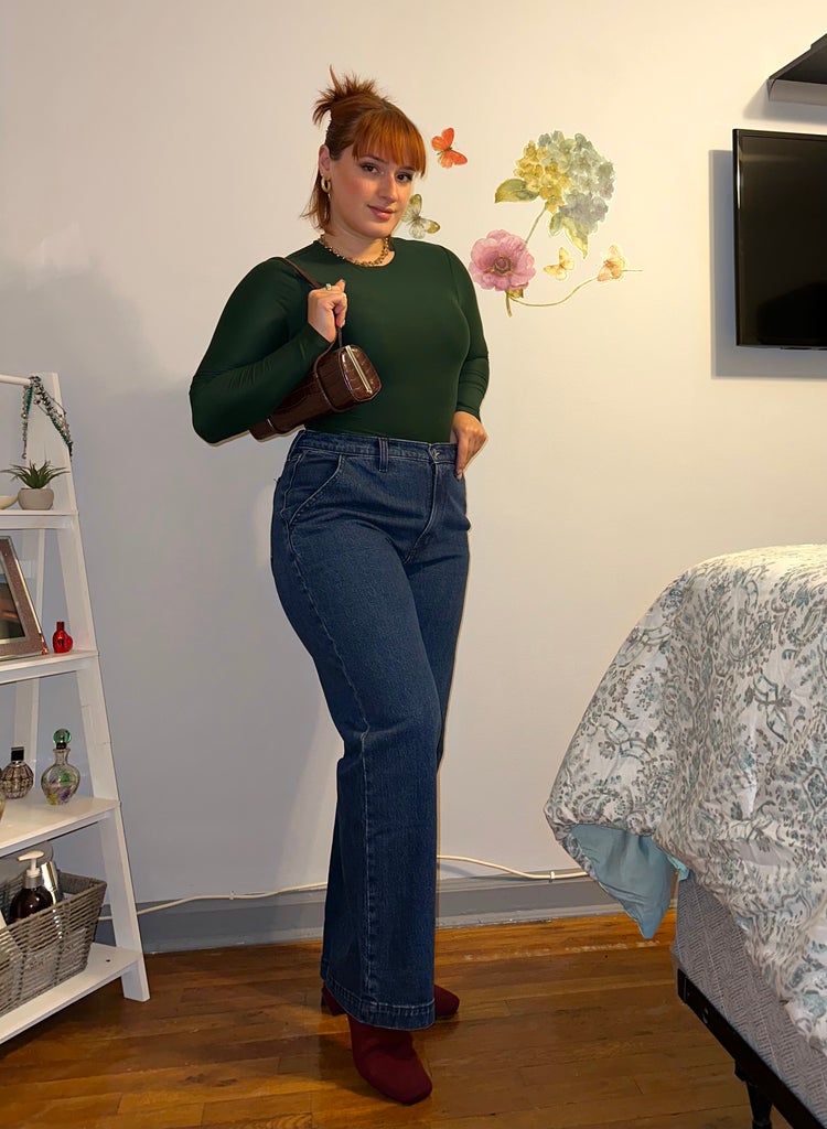 While the jeans were already a hit, I also need to call out that this is the softest bodysuit I’ve ever owned. This long-sleeve crew bodysuit has a velvety meets buttery texture, and while it’s matte, you can see that it has a really pretty sheen finish under flash photography. I’ve been very into green lately, so I’m in love with this color, but the bodysuit is also available in other festive burgundy and red shades as well as several neutrals. I opted for a Medium, in line with the size chart, which focuses on your bust measurements. At first, I thought it was too snug, but it actually acted like a taut second skin that got more comfortable the longer I wore it.