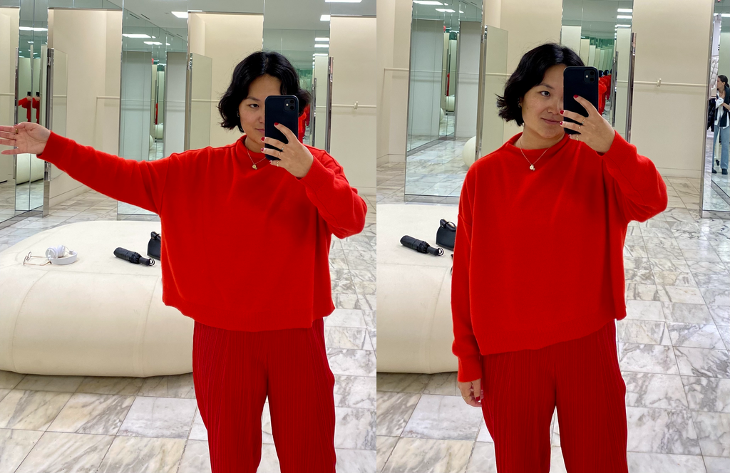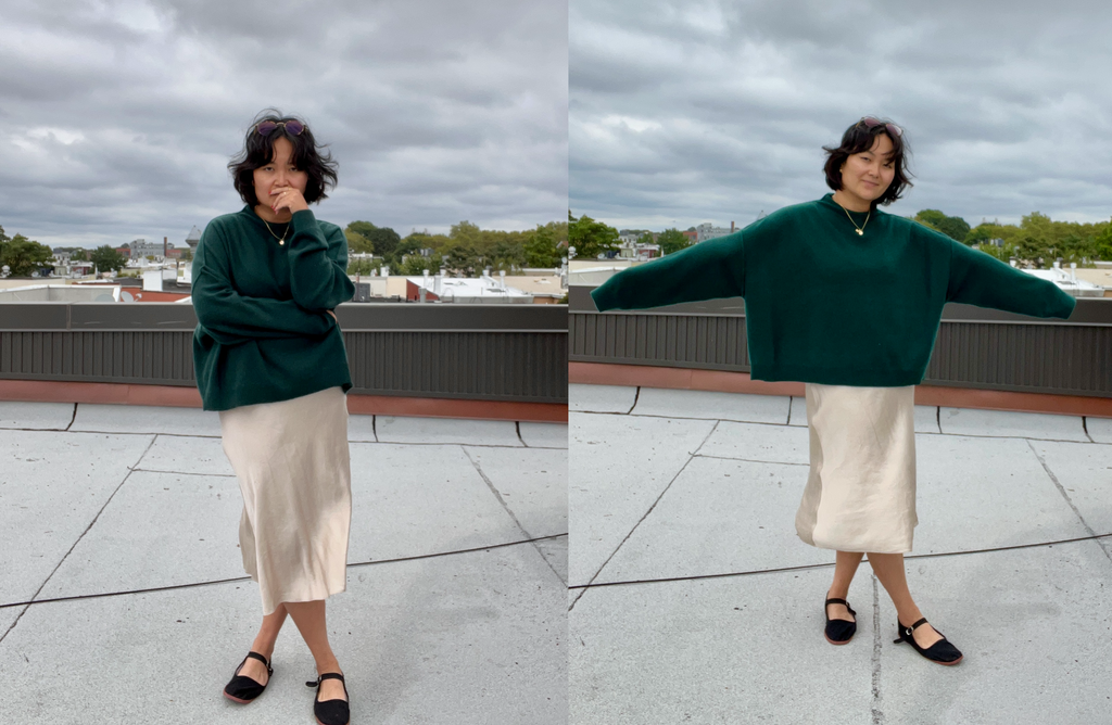 Because I myself am a fan of the oversize look, I gave the Alani a test drive in my usual size of medium (in red) and one size up to a large (in dark green). Both fit as expected — you can see when my arm is outstretched how much boxier the width gets — and they’re similarly comfortable and roomy enough to be layered on top of a tank or tee. With sizing, it’s truly a matter of preference, but I would have to say I’m particularly surprised by how much the sized-up sweater beautifully drapes. Just be advised that the sleeve length does extend significantly — for instance, the medium sleeve stops right at my wrist whereas the large sleeve covers my entire arm.