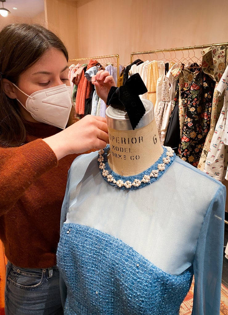 As an American designer who’s adamant about supporting New York’s Garment District, being selected felt like a win not just for her, but for all of the local garment workers who helped get her there. “It’s dwindling,” she says of the Garment District. “They have incredible resources there, not to mention incredible workers and artisans. It’s important to give them support even more so now during COVID; everybody’s struggling, so the more attention that I can draw to the Garment Center, the better.” Much of Dr. Biden’s dress was created there, before it was later taken to O’Neill’s studio to be hand-beaded with Swarovski pearls and crystals.