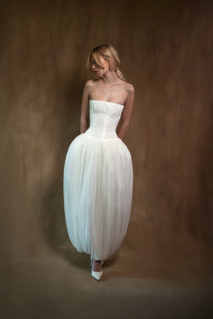 Brooklyn-based Tanner Fletcher launched bridal in 2024 with a whimsical take on bygone eras. For Spring 2026, the genderless label looks back to the past with looks like a slinky leg-and-shoulder-baring, Art Deco-inspired update on a ‘30s bias-cut gown; an inventively quilted and floral-appliquéd ‘40s-esque fit-and-flare dress; and a saucy undone tuxedo, with a retro-ruffled shirt and boxers. “We’re leaning more into the antique [because it’s]sentimental,” says Fletcher Kassell, who co-designs with partner Tanner Ritchie. “A lot of our clients like to save the dress and pass it on.”