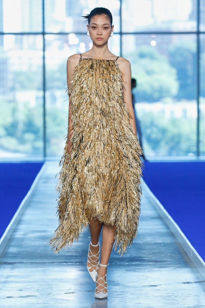 Despite commonly being found at party stores and relegated to New Year’s Eve soirées, the shiny decorative material has long been around. This Fashion Month though, it stole the spotlight when runway designers made the texture the central focus of their collections. Take, for example, Rodarte’s Laura and Kate Mulleavy who, inspired by gothic fairies, displayed a slew of silver and black tinsel dresses, jackets, and capes in their collection. Or: LaQuan Smith who put a disco spin on the look with black mini dresses. New York-based label Tibi also put a fun touch to its lineup with gold metallic fringe kitten heels for its fall 2023 collection.