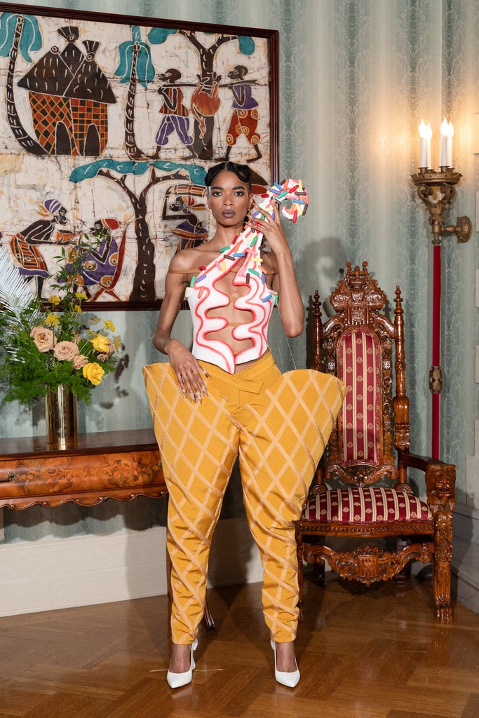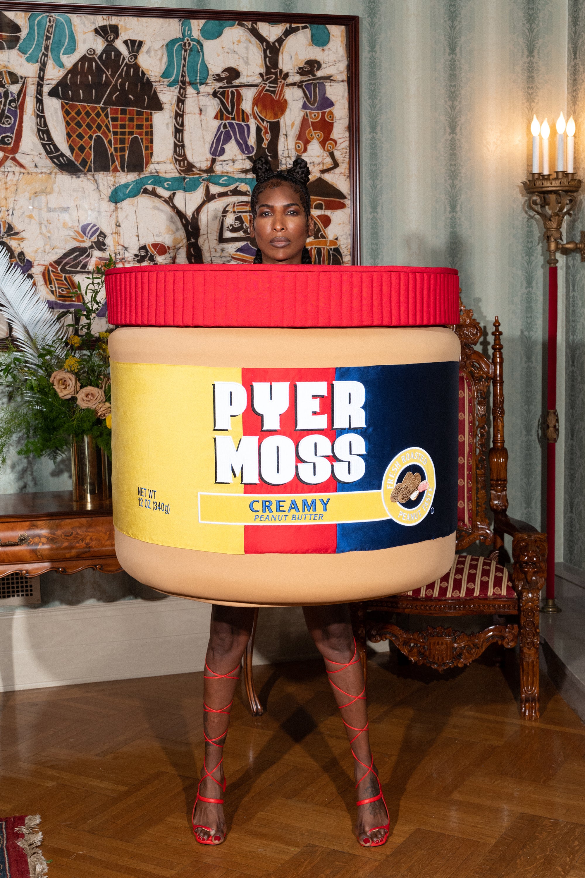 Although fashion rarely delves into conversations on race (and is, in fact, often criticized for instances of appropriation and insensitivity), Pyer Moss has long tackled nuanced topics by presenting them wrapped in elegantly wrapped fabrics, bold colors, and voluminous silhouettes. In line with shows presented during Haute Couture Fashion Week, the “Wat U Iz” collection doubled down on the volume and drama with oversized ice cream cone-patterned chaps, a bottle cap-shaped skirt, a peanut butter jar art piece-turned-dress, and a Super Soaker-inspired blazer.