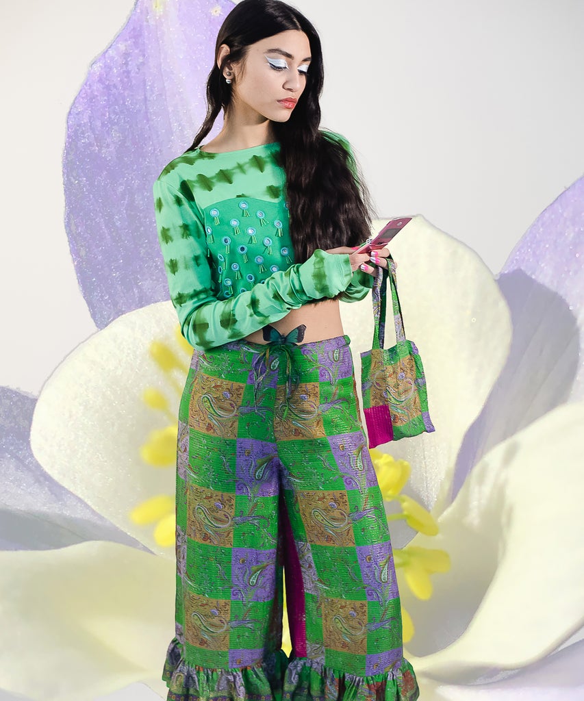 Last month, Sood launched the Up-Sari Set, a new line of matching sets made from upcycled vintage saris from India. Each set comes with a long-sleeved top, featuring a collar and a shell-button placket, as well as wide-leg pants — all made from woven cotton and silk fabrics sourced from the South Asian country.