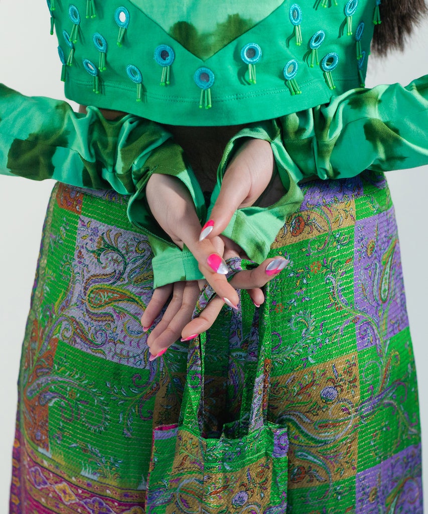 For this project, she chose saris made from tie-dying techniques that allow for intricate textile designs that form “tiny little circles.” In contrast to more elaborate saris, which can cost upwards of $1,000, Sood says that she’s able to keep the price of her Up-Sari set somewhere in the middle of the spectrum by sourcing more simple garments. This also allows her more room to play as she cuts up the vintage sari to create her matching set. “Even if it’s a custom-made set, I didn’t want the price to be so high,” she says. “I chose saris that I loved for the color and design.”