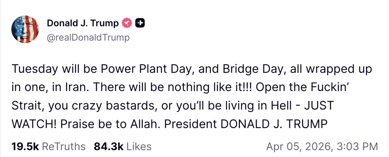 “Open the f**king strait, you crazy bastards, or you’ll be living in hell. JUST WATCH! Praise be to Allah,” the US leader wrote on his Truth Social platform, threatening to demolish Iranian power plants and bridges if it does not comply by Tuesday.