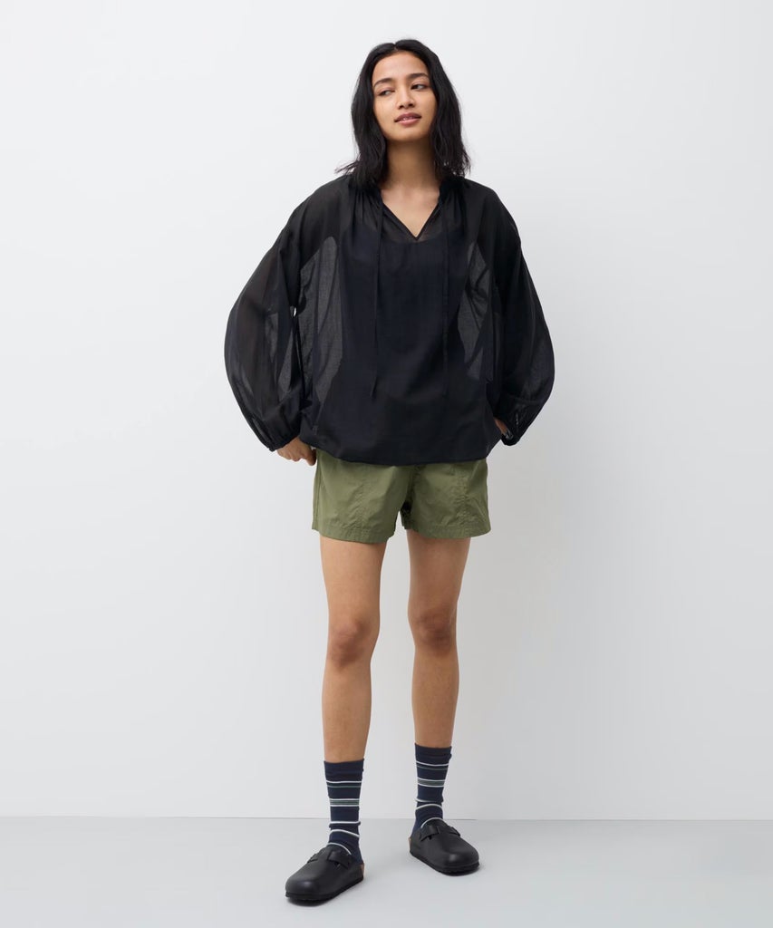This blouse ticks lots of boxes: it can be easily layered, dressed up and down, and has a trendy edge with its semi-sheer fabric. Pair with a vest or waistcoat, fitted trousers and platform loafers for an office look, or with a mini skirt or shorts for a casual weekend outfit.
