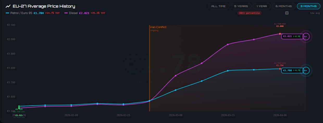 Petrol prices in the UK have surged to over £1.58 ($2.14) a liter on average, up from £1.33 before the war, according to the Royal Automobile Club. Rising prices encouraged a 27% increase in drive-off thefts, according to a crime prevention watchdog Forecourt Eye.