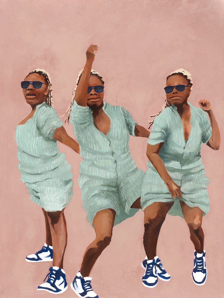 Artwork by Olamide Ogunade featuring Warby Parker x Entireworld’s Hatcher in Oxblood and Entireworld’s Short Sleeve Sweatshirt and Sweatshorts.