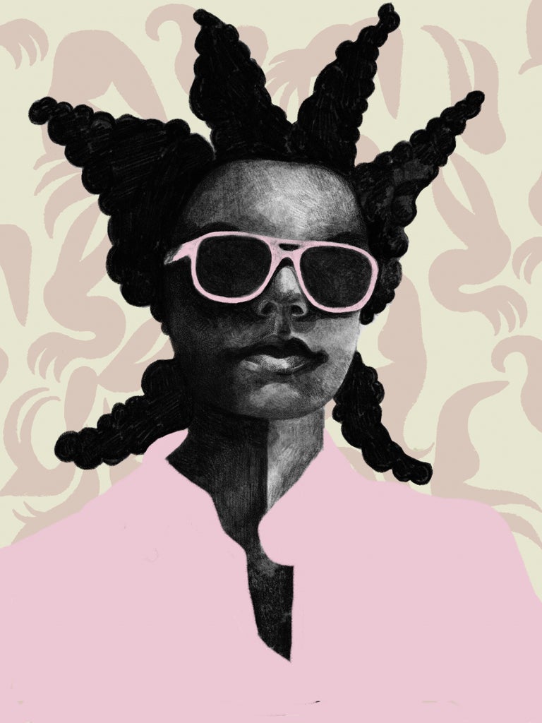 Artwork by Brooke Fierce Bronner featuring Warby Parker x Entireworld’s Hatcher in Midnight and Entireworld’s Block Print Dress.