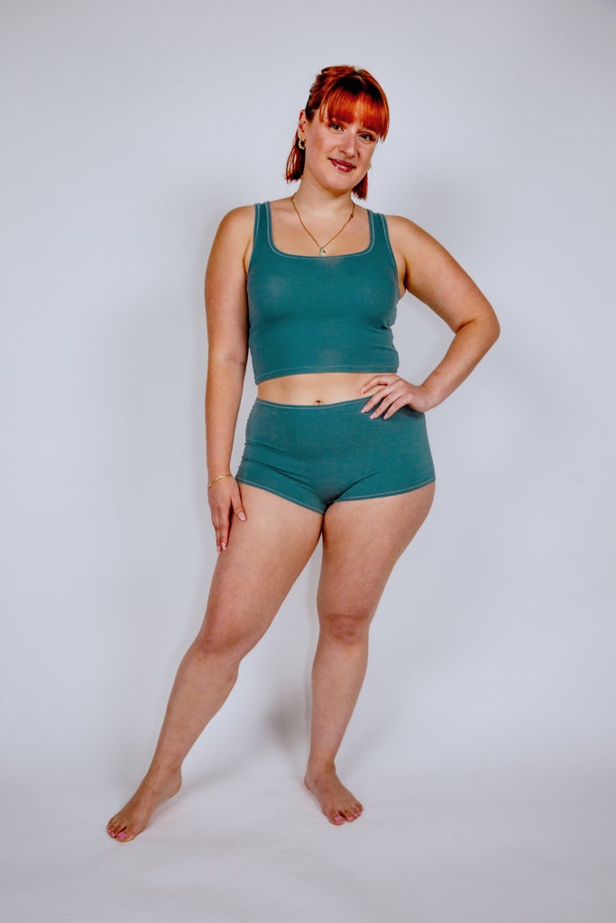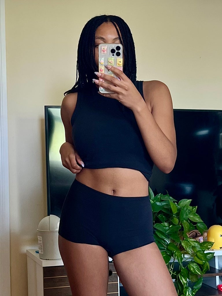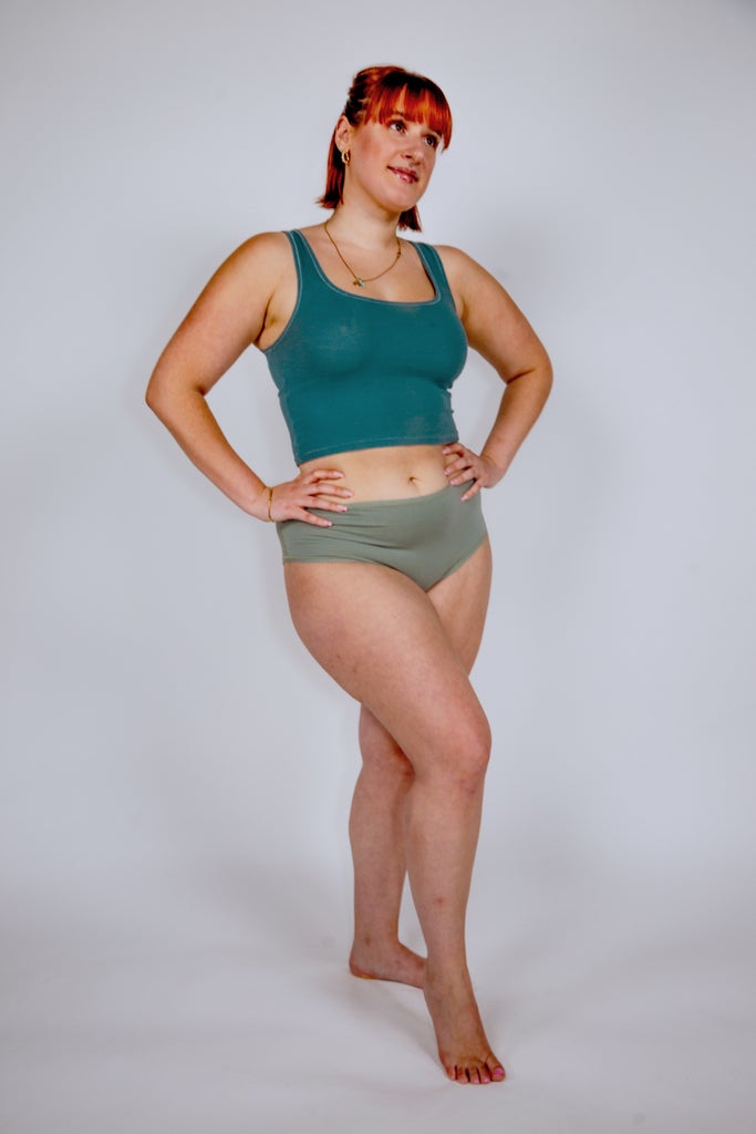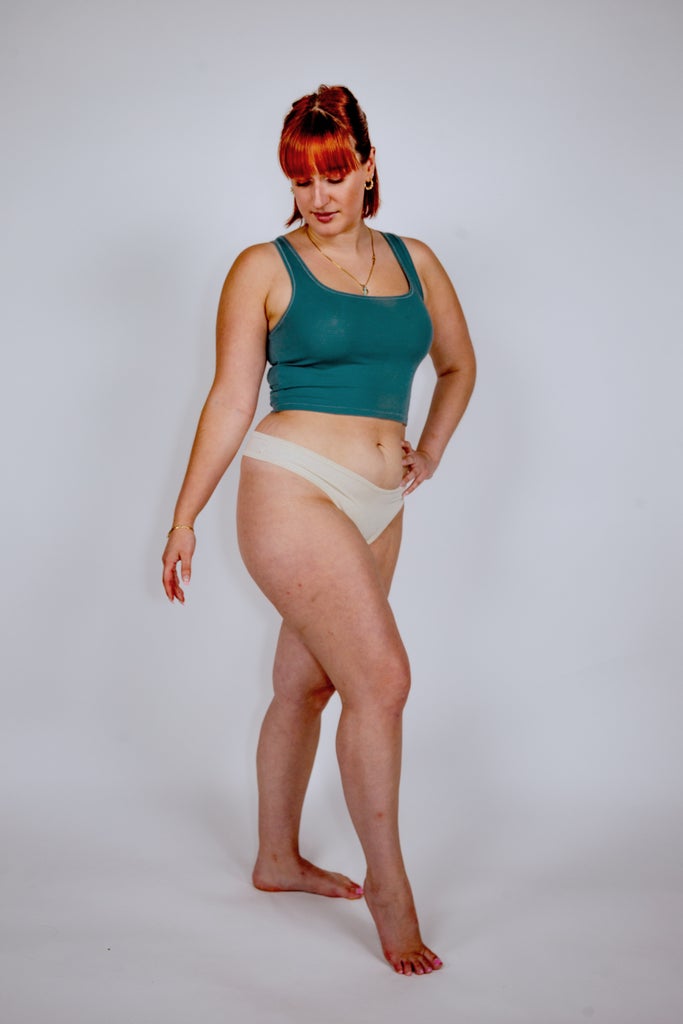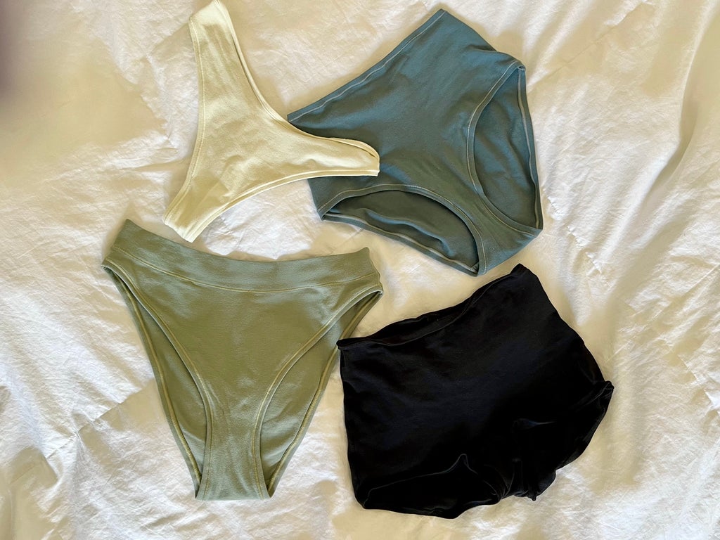 “I finally tried the Full Brief in a muted green Mineral colorway. This cut fell slightly below my belly button and offered medium coverage in the back. I can see myself actually wearing this style out, since it isn’t as high-waisted as the boy shorts. Another thing to note is that I typically wear seamless underwear, and while all of these styles have seams (with cute stitching!), they aren’t as thick or noticeable through clothing as, let’s say, a pair of Hanes cotton underwear. This pair was super comfortable and I think it’ll be my new go-to, especially during that time of the month.” Victoria Montalti, Associate Affiliate Writer