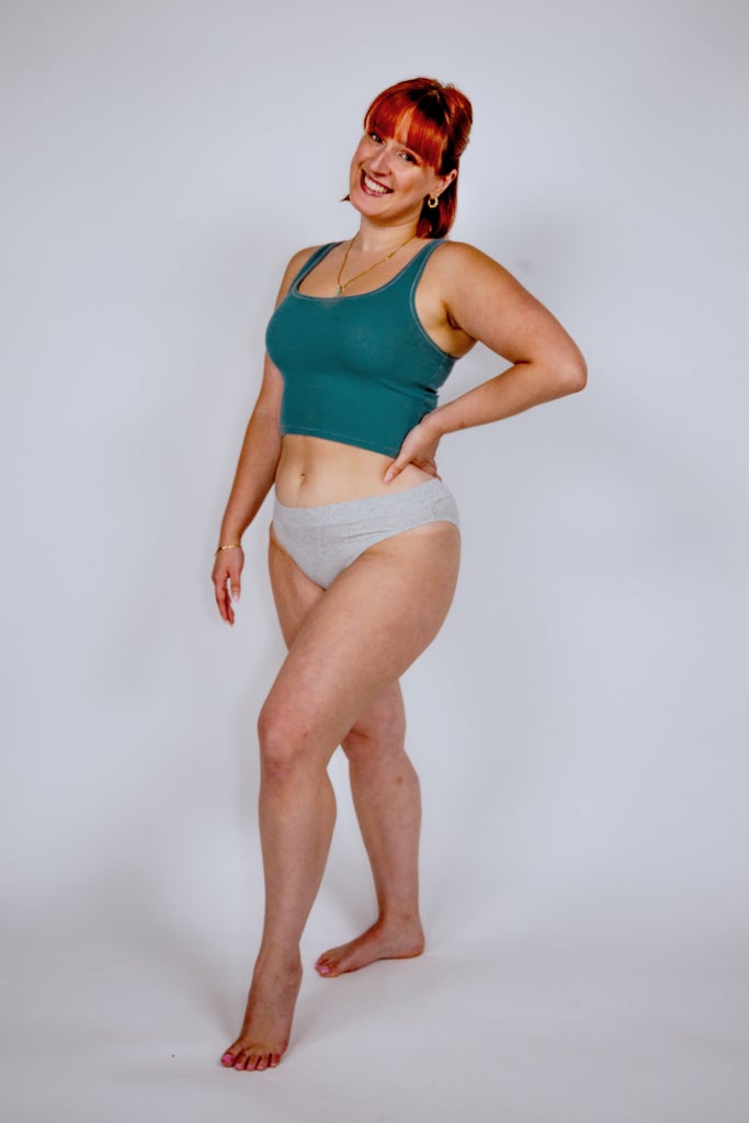 “The Cheeky Tanga is different from the boy short in that it has a wide waistband, which offers slightly more compression, and high-cut legs that I found really flattering. It’s also slightly cheekier than the Full Brief because of the higher leg holes. Overall, this cut is the most similar to the types of bikini bottoms I tend to wear. I got it in Light Heather Grey, which has a retro look to it that I really like. Because of the waistband and seams, I personally wouldn’t wear these out under fitted bottoms since I’m not a fan of underwear lines, but I would wear them under looser styles, and most definitely around the house.” Victoria Montalti, Associate Affiliate Writer