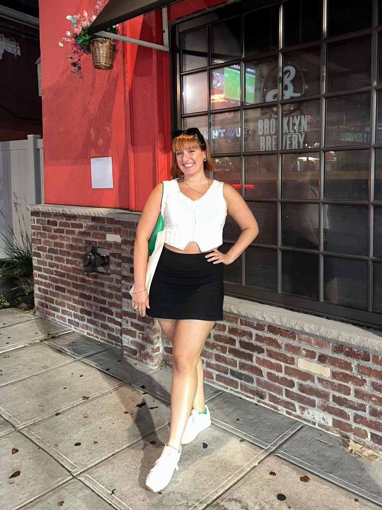 “I’ve actually never owned a skort as an adult, and this Pact style made me question why that is exactly. My initial reasoning for never wearing mini skirts was because I thought my fuller figure waist-down would make me flash people. But skorts were the obvious solution, and I’m so happy I have this one in my arsenal now. I chose the classic black colorway for its versatility and got a size Medium, which offers me a snug but not-too-tight fit. I again feared that it would be too short in the back, and while it is a very leggy look, the skirt didn’t rise enough to make the shorts peek from underneath. My favorite parts are the thick waistband that adds some compression to my lower stomach and the mini slits on the sides of the legs. And while the athleisure material is more casual, it’s sleek enough that I confidently paired it with a long white button-down and heels to NYFW events without feeling un-dressy in the slightest. I’ve also worn this Pact skort with crop tops and sneakers, and plan on transitioning the piece to be fall-appropriate with sweaters, boots, and possibly some sheer tights for extra warmth.” —Victoria Montalti, Associate Affiliate Writer