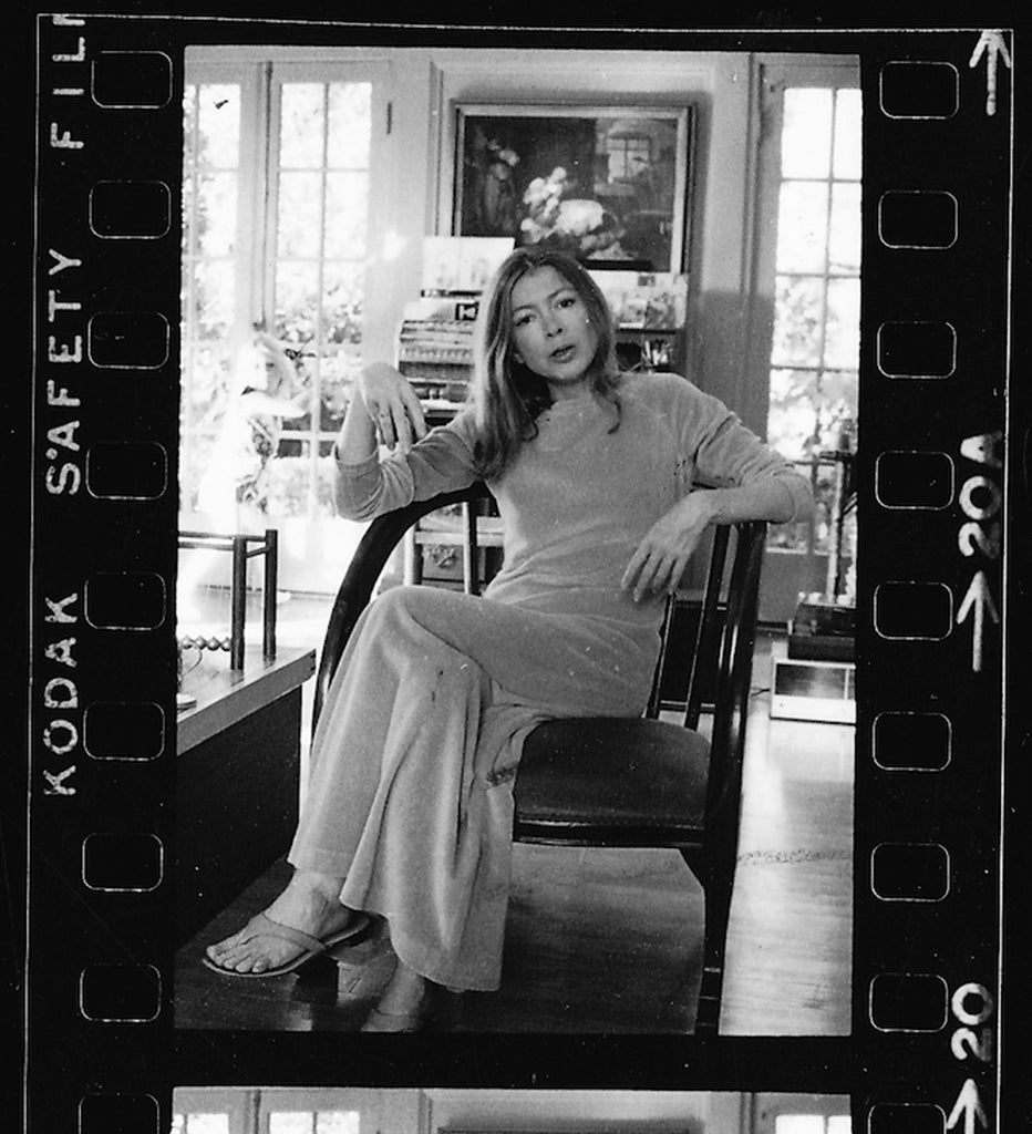 Impossibly chic writer Joan Didion, who, from her 1960s Vogue essays to 2015’s Juergen Teller-shot Céline campaign, is fashion’s most coveted and referenced muse, also demanded ease from her clothes. In a 1979 Vogue interview with the author, the journalist Georgina Howell described Didion, standing at 5’2, as “a size too small for her clothes” — but what if this oversized quality was intentional? According to Newman, “the maxi dress and flip-flops she wears in front of her Corvette in the 1968 Julian Wasser shot” was typical of her loose-fitting, easy-going style, particularly as she retreated to her San Francisco home to write. A wardrobe of simple long-sleeved black tops, calf-length skirts, and roomy column dresses – worn with flip-flops, sandals, or bare feet – made for a style that fused her time in New York with her Californian roots but put comfort above all else.