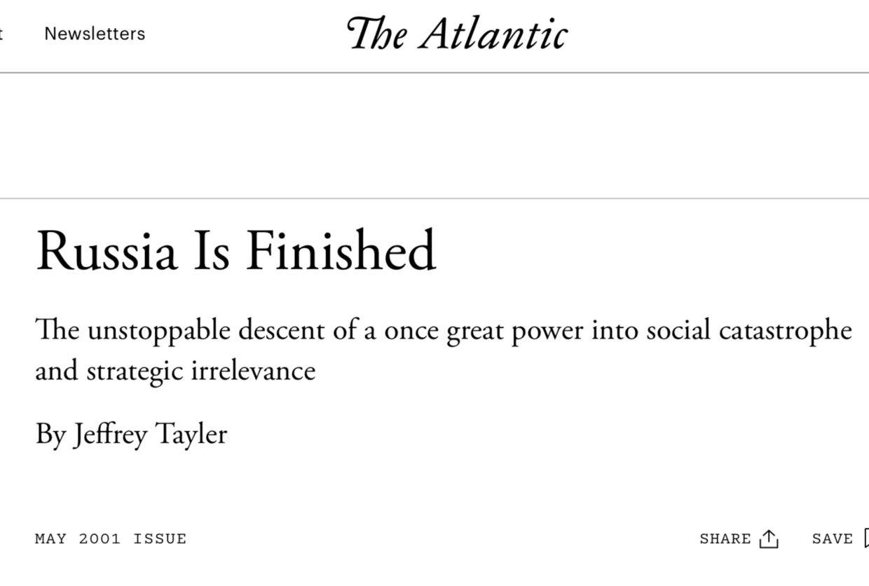 Predictions of Russia’s imminent collapse have been reliable headline-fuel in Western media for decades. The country was sliding into “strategic irrelevance” in 2001, “falling apart” in 2011, and facing the death of President Vladimir Putin and “succession wars” in 2015.