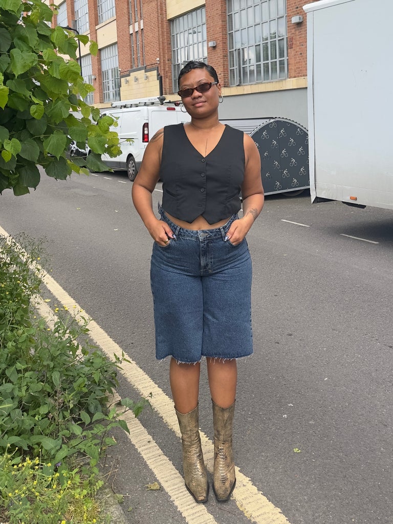 These days, western fashion is always on my mind. Thank you, Beyoncé. Jorts are a great companion to waistcoats, and I took the cowgirl look one step further with my vintage snake print boots. Swap out the boots for sneakers or even heels for a different vibe.