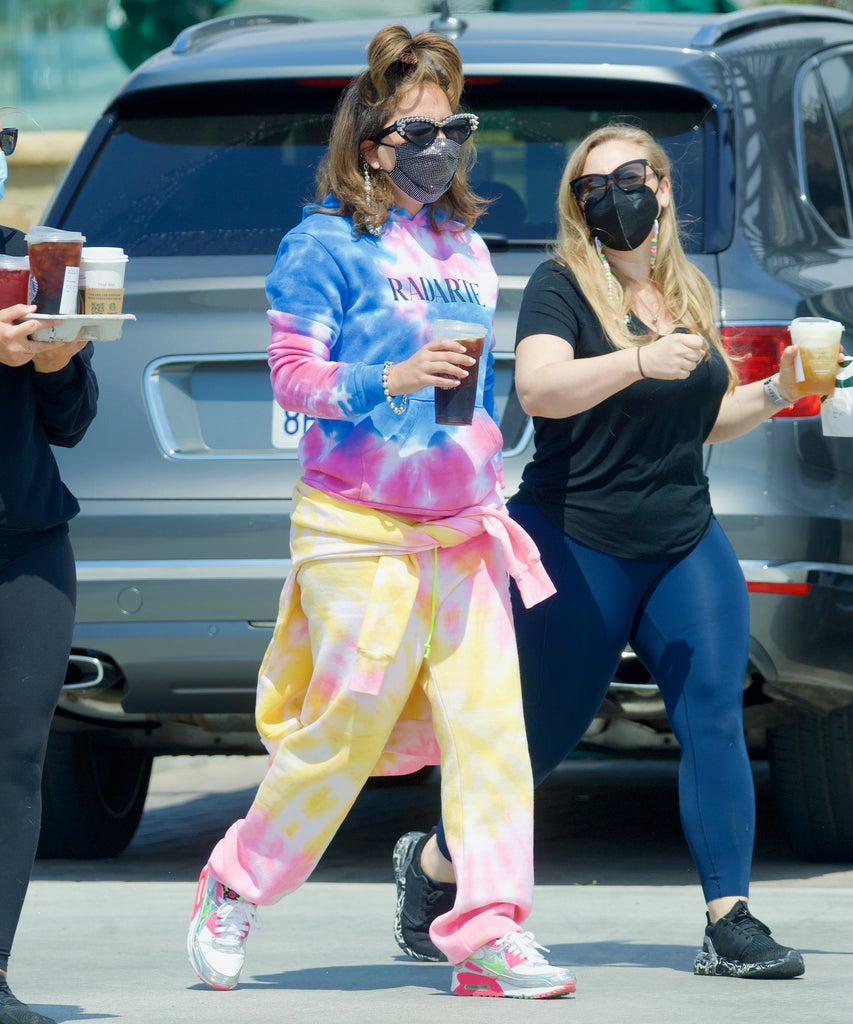 After months of seeing Lady Gaga wearing luxury ensemble after luxury ensemble on the set of Ridley Scott’s upcoming film House of Gucci in Rome, the singer-actor is back in L.A., taking a break from high heels and wedding dresses. On Tuesday, Gaga was spotted post-Starbucks pick-up wearing a bright tie-dye sweatsuit from Radarte, the casual spin-off of SoCal fashion brand Rodarte.