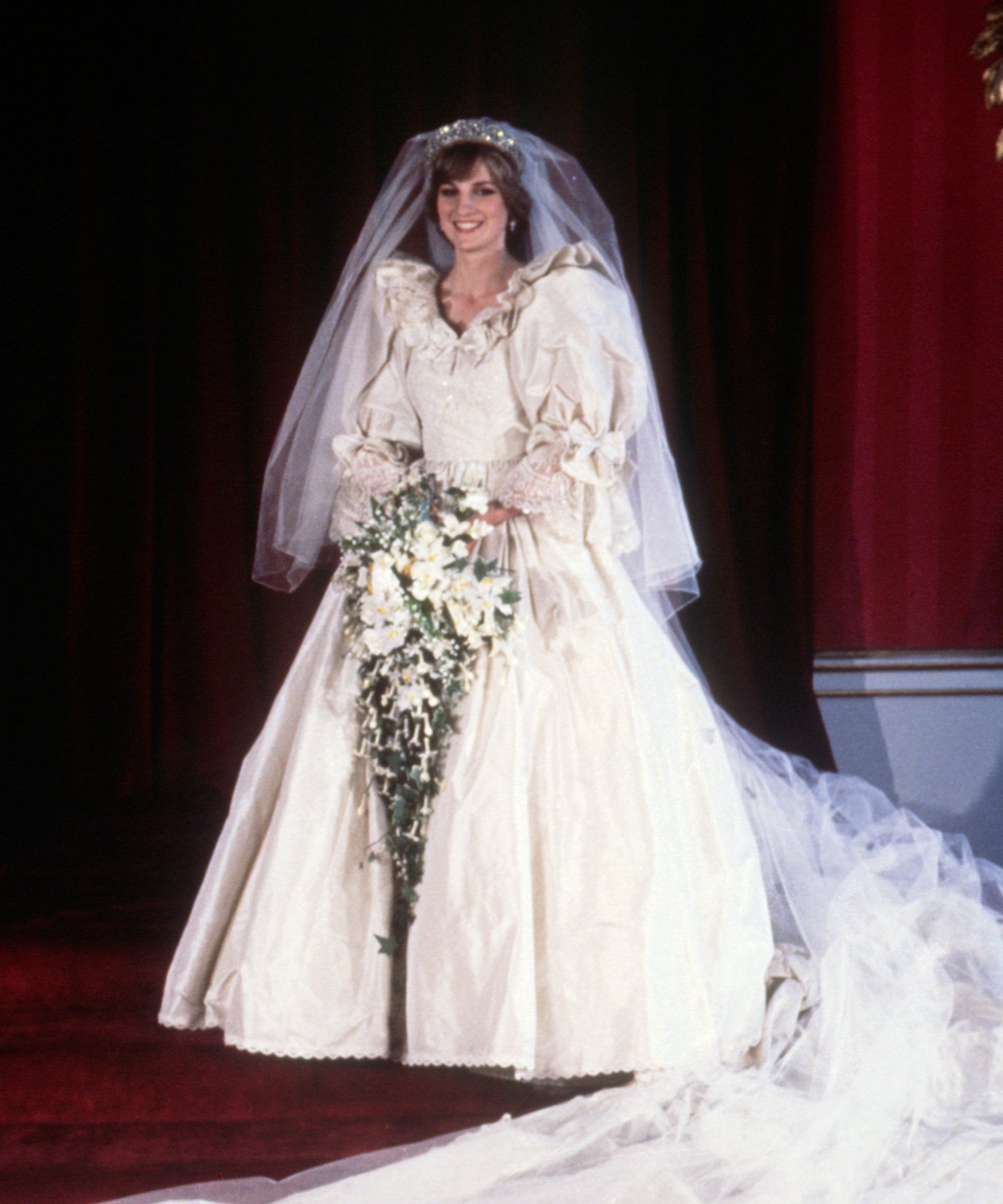 The ivory dress featured dramatic puffed sleeves and encrusted pearls and sequins that shone brightly during Princess Diana’s arrival at London’s St. Paul’s Cathedral in June of 1981. She styled the gown, made by Elizabeth Emanuel, with her family’s tiara and a 153-yard veil, which sadly will not be displayed at this year’s exhibition, according to Women’s Wear Daily.
