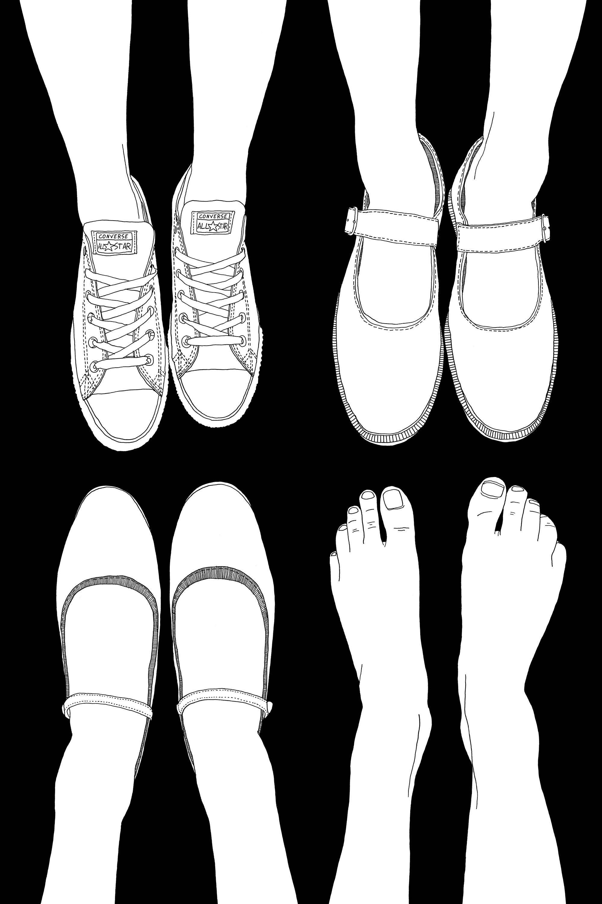 Our feet were the same size. We sat and waited on a mauve velvet bench. I tucked the bikini strings into her dress. She took her shoes off. So did I. We put our feet side by side. Mine were wider, toenail polish still chipped pink from junior prom. Her toenails were painted black.