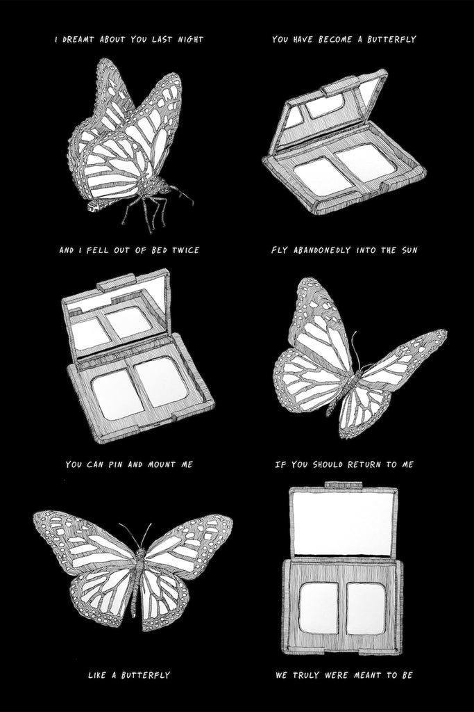The Bloomingdale’s beauty department was cool, bright, and gleaming, with shiny black-and-white-checkered floors and gorgeous grids of every color eye shadow: metallic blacks, oranges, and greens like butterfly wings; silvers and opals like something from outer space; flat chemical pastels like conversation hearts: call me, kiss me, love me. A woman worried over a small, round, lit-up mirror, blending a different shade of olive concealer into either cheek, checking one side of her face, then turning her head to compare it with the other.