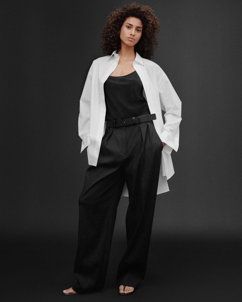 The 50th Anniversary collection is “centered around the monochrome classicism of tuxedo dressing” with a “seductive palette of black,” according to the press release. The 128-piece capsule includes sleek trousers, suiting separates, and cocktail dresses — along with a limited-edition graphic T-shirt ($45) — and tons of accessories that go from day to night.