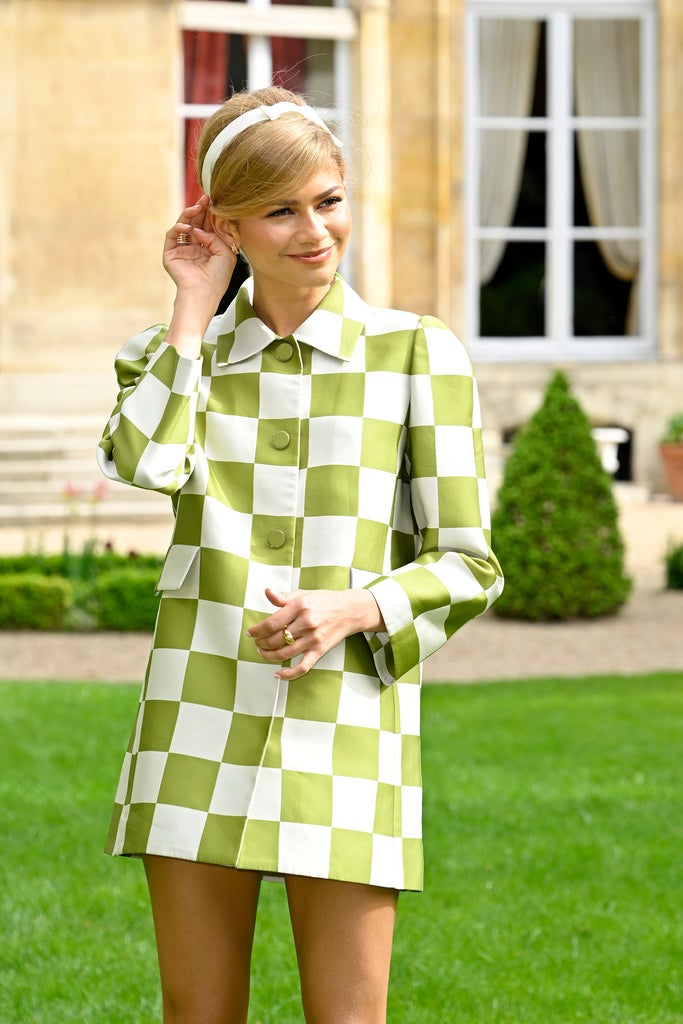 During a Paris photocall, the Challengers star wore a ‘60s-inspired mod jacket dress with Louis Vuitton’s signature Damier checkered pattern from the Spring/Summer 2013 collection. Law Roach also pulled an archival Ralph Lauren Spring 1992 polo-neck halter mini dress, originally shown off by supermodel Cindy Crawford on the runway, in the nod to the ultimate ’90s prep brand.